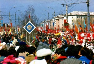 80-е годы. Первомай на улице Подбельского г. Братска. Фото с сайта fotki.yandex.ru. Разместил — blinow
